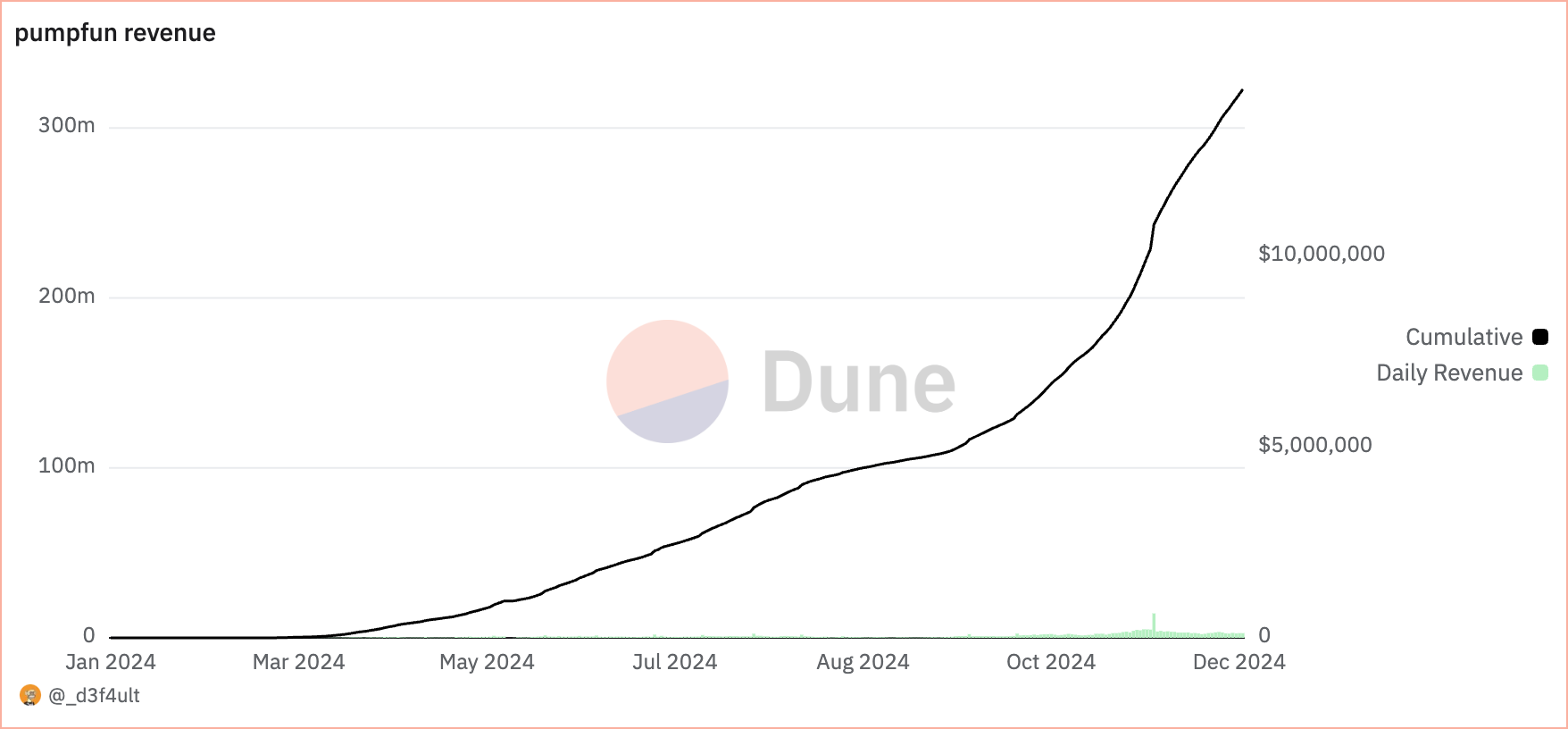 Solana’s architecture has also enabled speculative, viral phenomena like memecoin mania. Platforms like Pump.fun, where anyone can create and trade meme tokens, wouldn’t be feasible on slower, more expensive chains. The result: over $300M in revenue generated by Pump.fun this year alone. This chaotic, speculative environment might seem trivial at first glance, but it serves a crucial purpose: onboarding millions of users who create wallets, transact, and explore decentralized ecosystems—often without realizing they’re using blockchain infrastructure.